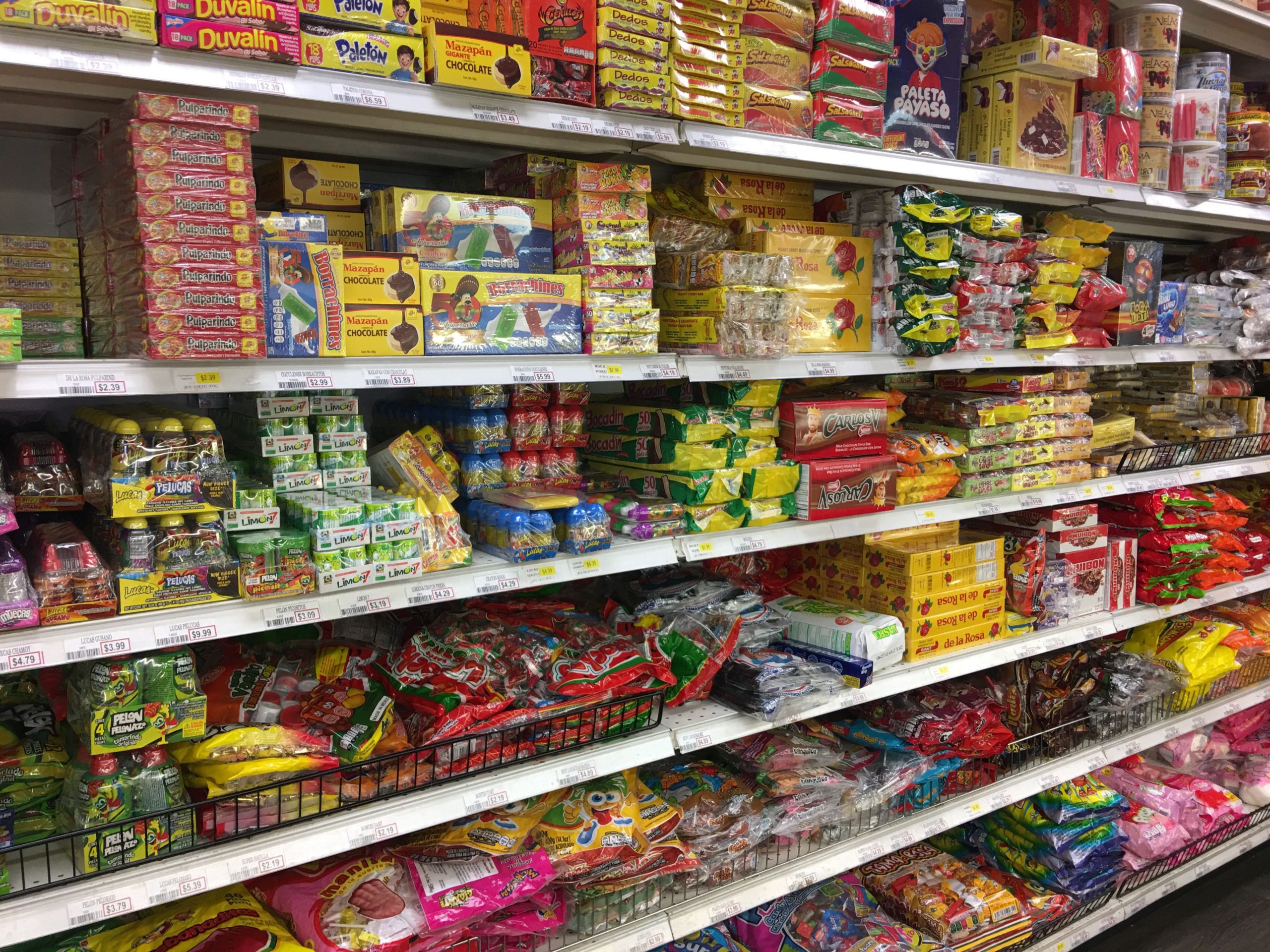 メキシコの子供の誕生日会で欠かせないピニャータ(中にキャンディを詰め、目隠しをしたお誕生日の子供に棒かなんかで割らせ、誕生日会に参加した子供たちでキャンディを拾うというゲーム。日本のスイカ割りとやや似てるかな。)も天井からいっぱい吊るされて販売されてます。タコス、トルティーヤは言うまでもなく、見たことないメキシカンなお菓子やモーレ・ペースト等のメキシカンならではの食材もあります。